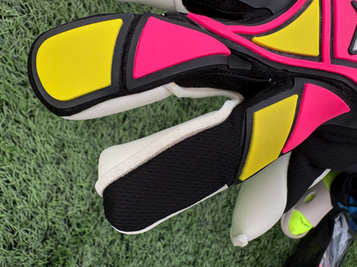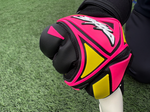 そのため、パンチング時のスリップ軽減は当たり前であるが、何よりも0.1秒を争うゴールキーパーのパーからグーへの切り替えのために、ゲルを切り分けたり、凸凹加工を行なっている。