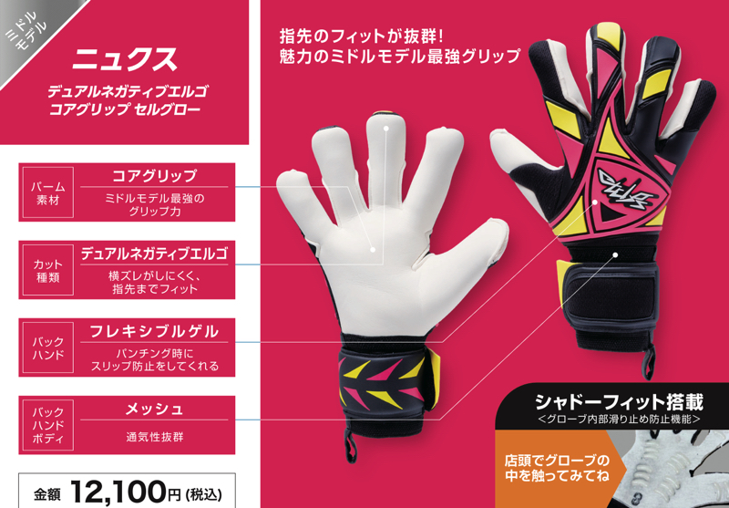 また、キーパーグローブの内側には「シャドーフィット」と呼ばれる手のひらとキーパーグローブのズレを軽減する加工を行なっている。